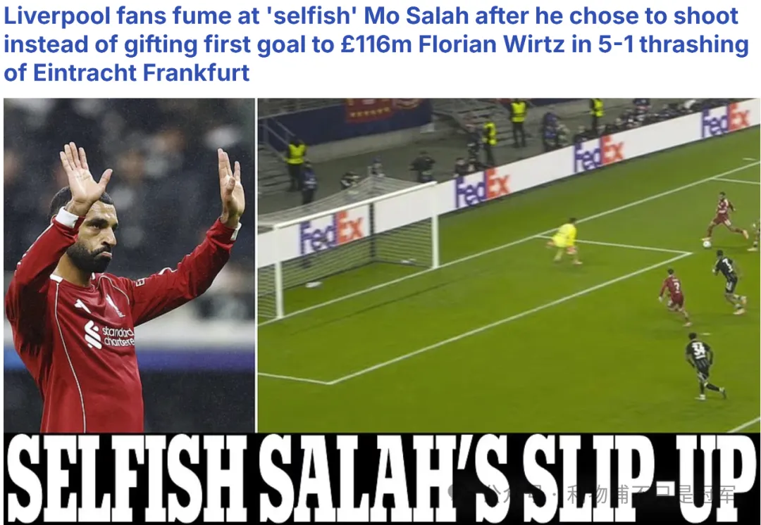 很多球迷都对萨拉赫最后这个球不传维尔茨意见很大,甚至上了《每日邮报》体育版头条,我倒觉得不用太苛责萨拉赫。