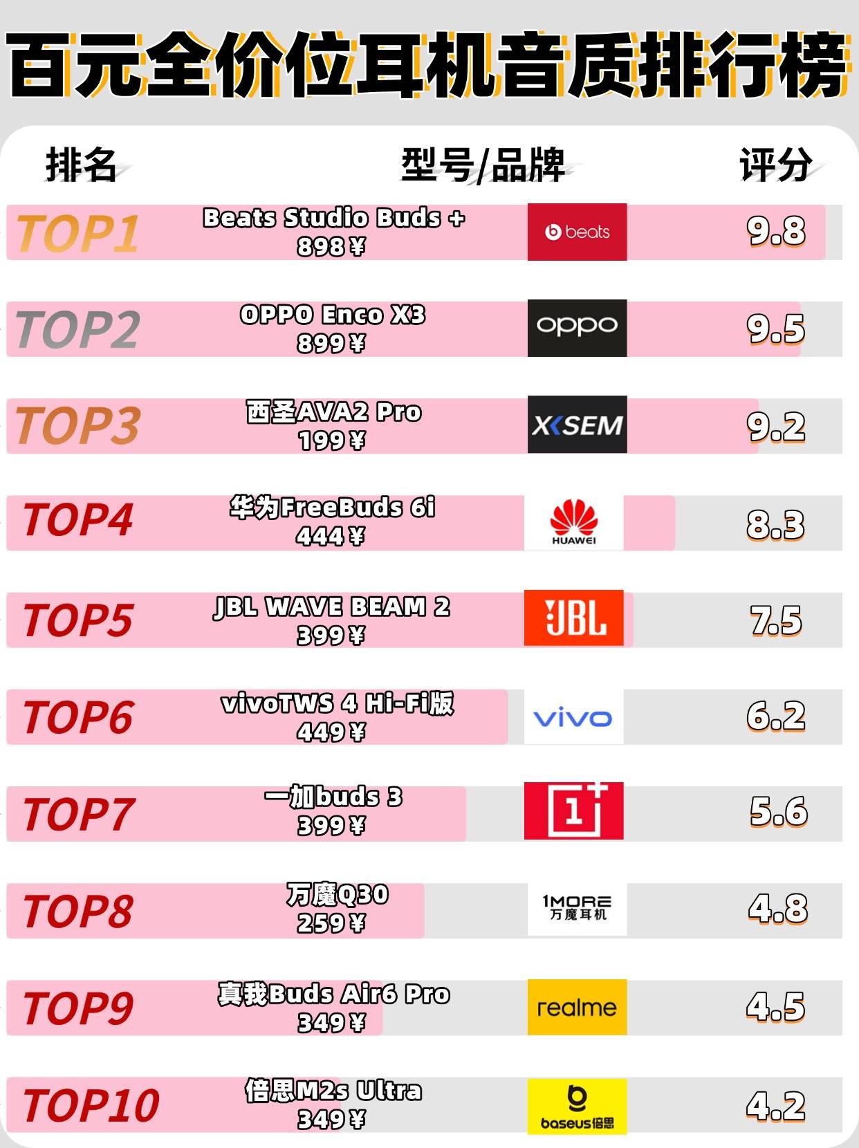 在正式推荐之前,我先放上一份专业机构整理的热门蓝牙耳机音质排行表,大家可以先对比看看。