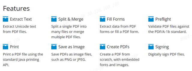 介绍组件PDFBOX在Java开源组件有一个PDFBox,可以针对PDF进行操作,它主要功能有提取pdf文本内容,pdf的合并和拆分,将pdf转换成为图片,将图片转换成为pdf,对pdf进行签名等等。