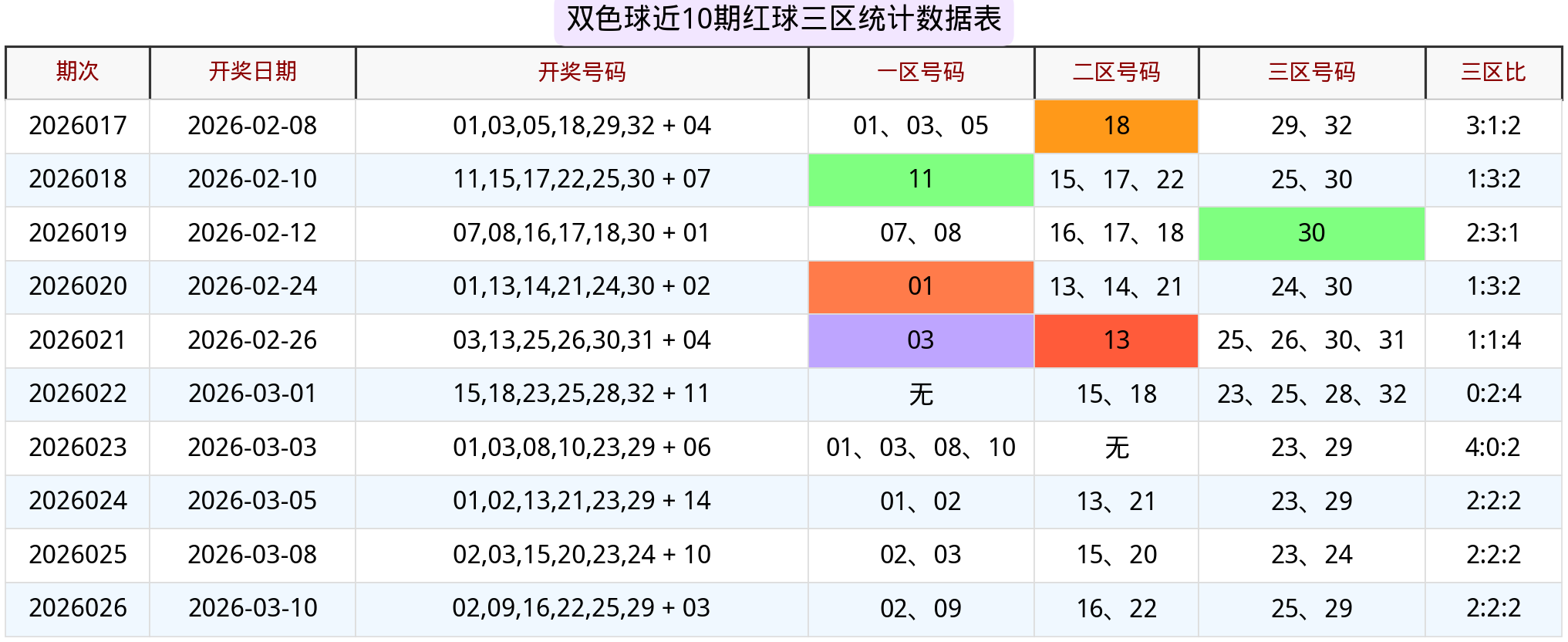 结论:因为二区的温号码很多,这期的策略是“抓冷补温”,重点关注冷号码12的回补,同时搭配13、18等温号码形成集群效应,热号码只需要防守一个重号即可。