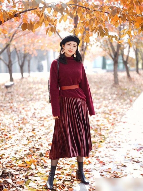 伞裙摆度能巧妙遮住胯宽,垂感好的针织裙保暖又显线条。