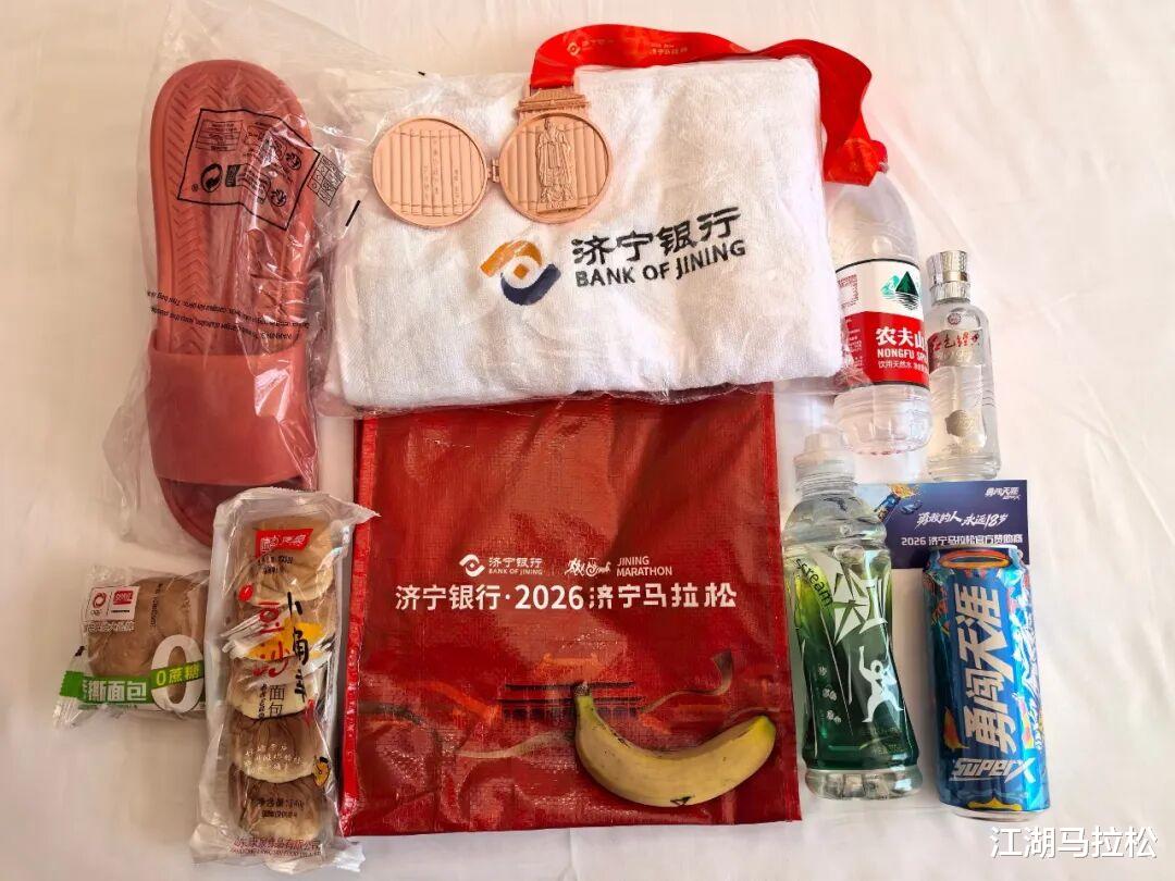 我留意到有不少责骂声,看社交平台上,甚至有外地跑者马上就打道回府的。我刷到了李子成领物的视频,他透露说完赛包很丰盛的。跑完后拿到,沉甸甸的,有大毛巾、拖鞋、吃的喝的,奖牌也挺有意思。