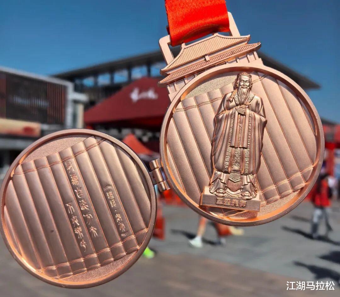 完赛奖牌上,也彰显了孔孟之乡的底蕴。能打开的奖牌不只好玩,还有可以转动、拿下来的孔子造像,另一面则有《论语▪学而》中的名句“有朋自远方来,不亦说乎”。