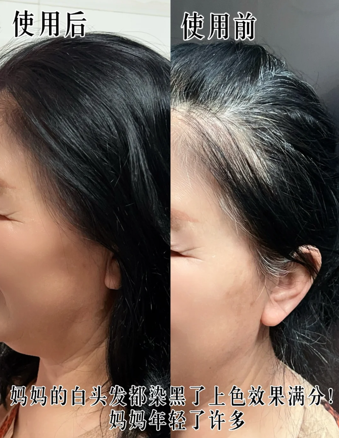 白发遮盖率高,能够均匀覆盖新生白发、两鬓顽固白茬以及全头大面积白发,不会出现斑驳、留白、色块不均等问题;染后发色自然柔和,不假黑、不僵硬,贴合亚洲女性的原生发色和肤色,适配日常通勤、家庭聚会、商务活动等各种生活场景。