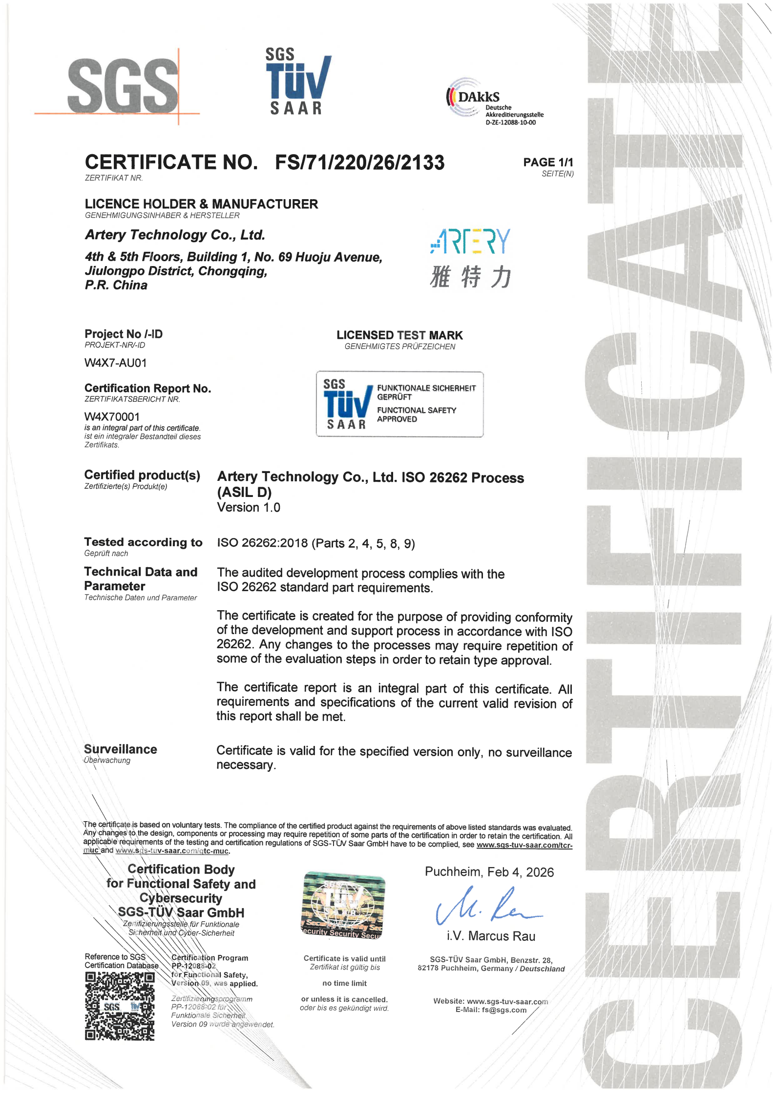 雅特力科技副总经理黄呈俊表示:“此次ISO 26262功能安全认证的顺利通过,标志着雅特力具备了开发最高等级车规芯片的能力,为进入全球高端汽车供应链提供了权威“通行证”,也进一步提升了国际竞争力。感谢认证过程中研发人员的辛苦努力以及SGS的支持,雅特力科技将继续加大在车规级芯片领域的技术投入,不断完善功能安全流程能力与产品布局,深化与产业链伙伴的协同合作,持续为汽车电子行业提供安全、可靠且具有竞争力的车规级芯片产品,共同推动汽车产业向更安全、更智能的方向发展。”