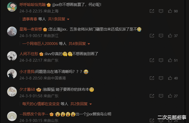 对此,网友们纷纷表示iivv(芥见下下)现在不想画就别画了,没必要画一个这样的来恶心读者,快点把真的五条悟还给粉丝,甚至还有人希望让芥见下下顶替前几天去世的鸟山明。不得不说,网友们的攻击力是真的高,不过这也不能怪他们,毕竟封面里面的五条悟是真的难看。