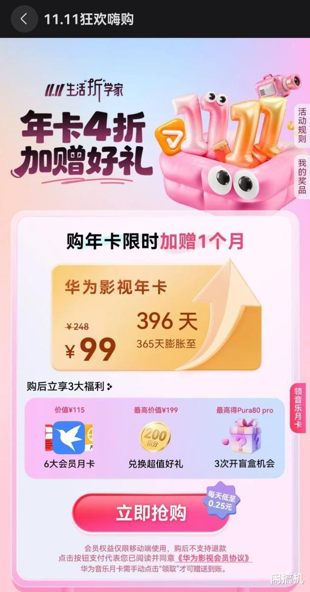 双11华为影视会员年卡限时4折优惠,还能兑换价值199元的超值豪礼与3次开盲盒机会,最高有机会获得华为Pura80 Pro手机。