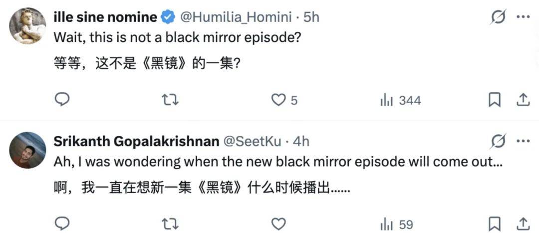 也有网友认为,「这不就是《黑镜》吗?」「我一直在想新一集的《黑镜》什么时候播出...... 看来就是现在了。」