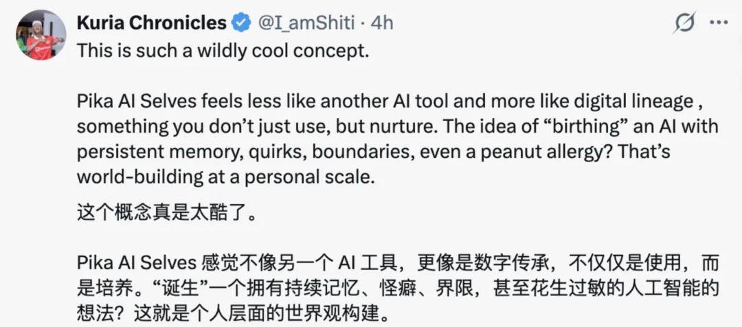 有网友认为,「这个概念真是太酷了。」Pika AI Selves 感觉不像另一个 AI 工具,更像是数字传承,不仅仅是使用,而是培养,「诞生」一个拥有持续记忆、怪癖、界限,甚至花生过敏的 AI 的想法,「或许这就是个人层面的世界观构建。」