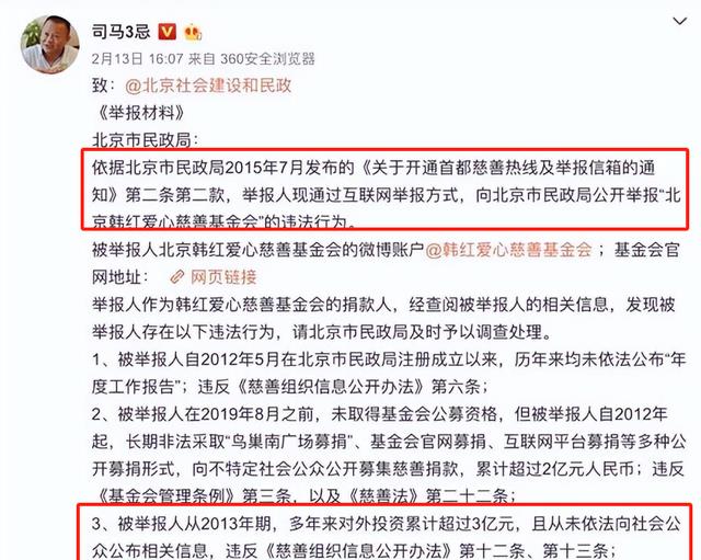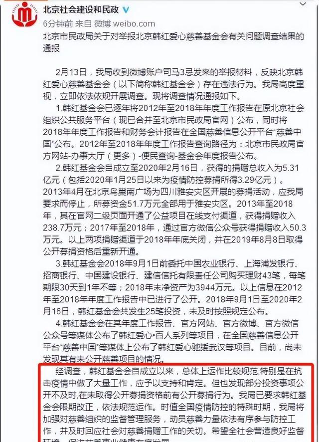 信息来源:天眼新闻2022.《韩红基金会被举报!刚刚,北京市民政局公布了调查结果》
