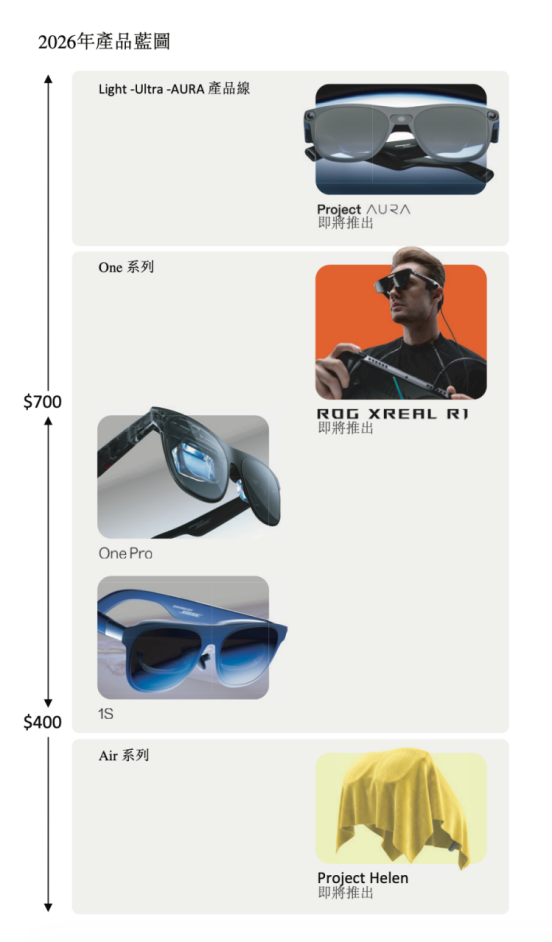 在技术层面,XREAL构建了“自研光机+自研芯片”的核心护城河,其旗下的Air系列与One系列产品已在全球消费者中建立了良好的口碑。面对2026年的市场机遇,公司已规划了完善的全产品线矩阵:包括面向大众市场的普及型眼镜“Project Helen”、联合顶级电竞品牌ROG打造的专业电竞眼镜“R1”,以及与谷歌深度合作、集成空间计算与多模态AI能力的下一代旗舰XR产品“Project Aura”。