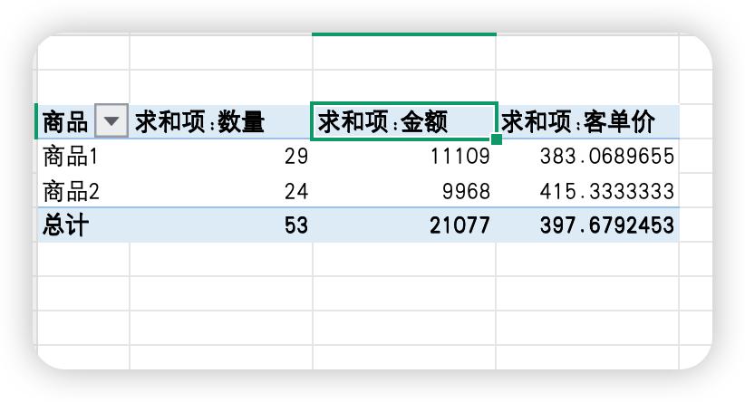 现在我们要汇总分析,每种商品的总数量,总金额,平均客单价