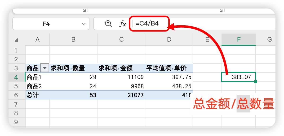 我们用商品1的总金额除以总数量,它的平均值是383.07