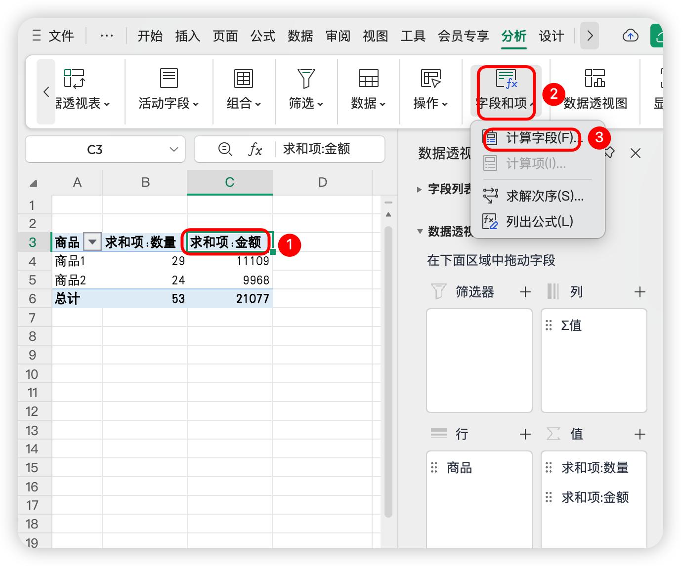 然后把光标放在数据透视表的字段上,点击数据透视表分析,选择字段和项,然后选择计算字段