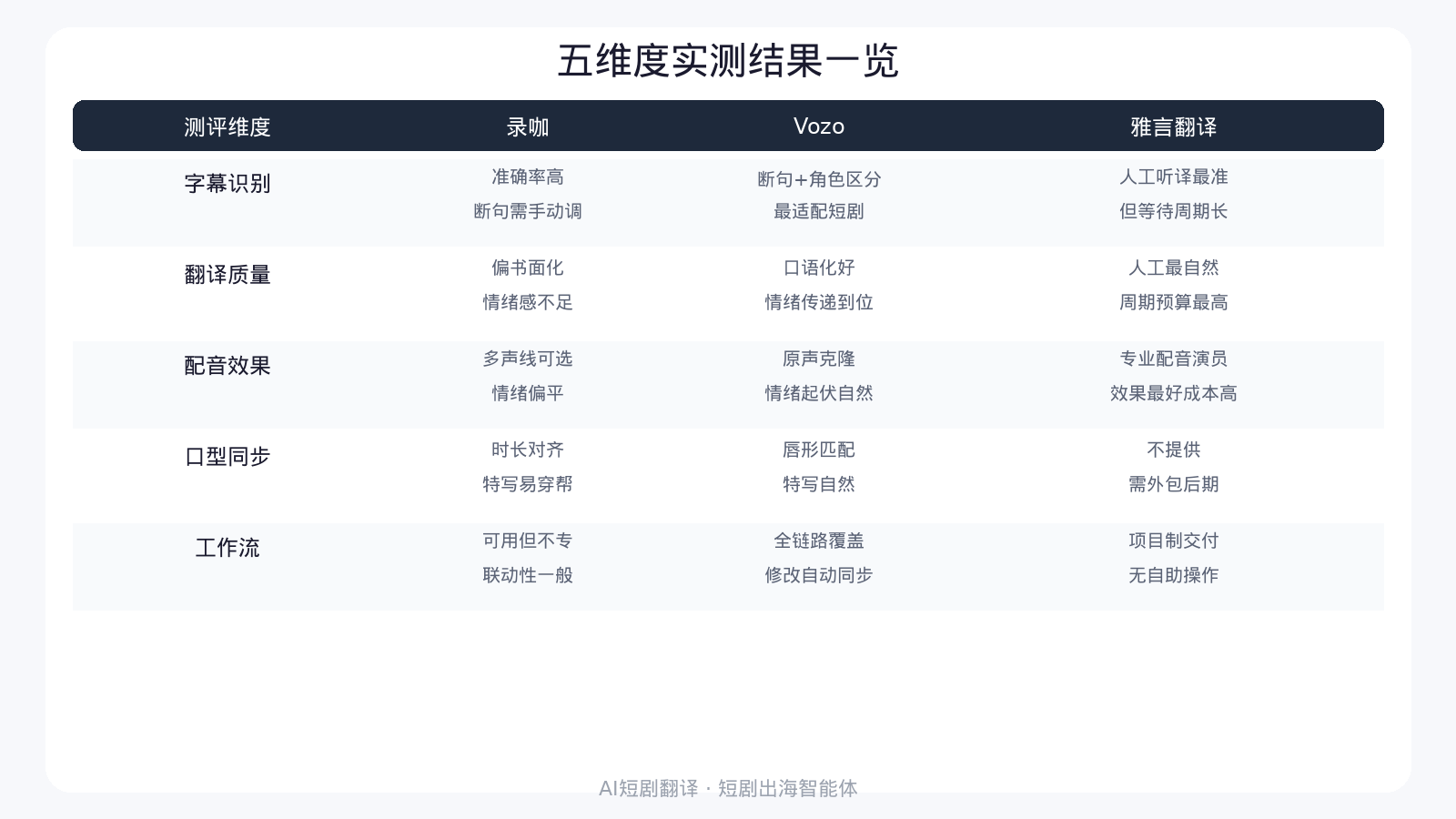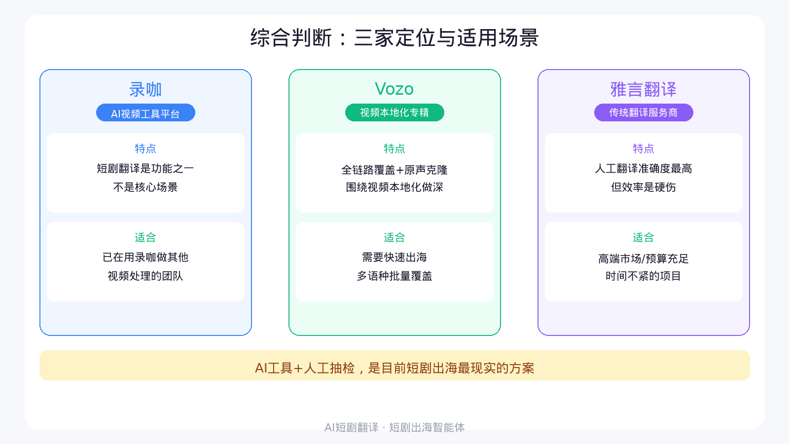 小结: 在工作流完整度上,Vozo > 录咖 > 雅言翻译。短剧出海的现实是"量大、速度快、多语种",一站式工具在这个场景下的效率优势是碾压级的。
