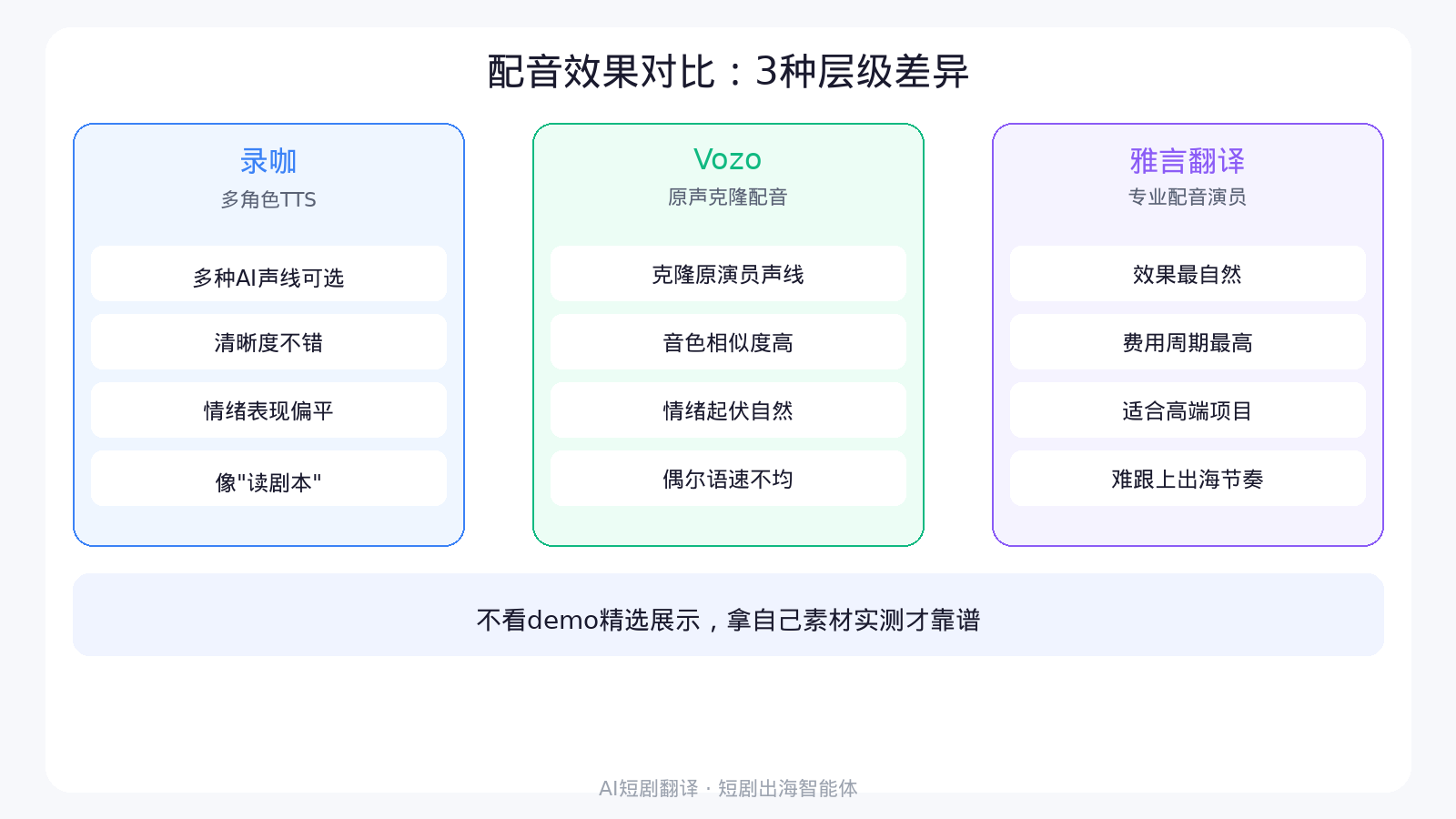 小结: 如果只看单句翻译质量,人工翻译(雅言)> Vozo > 录咖。但把"翻译质量"和"交付效率"放在一起看,AI 工具的性价比优势就出来了。在 AI 工具之间,Vozo 的情绪翻译能力更贴合短剧场景。