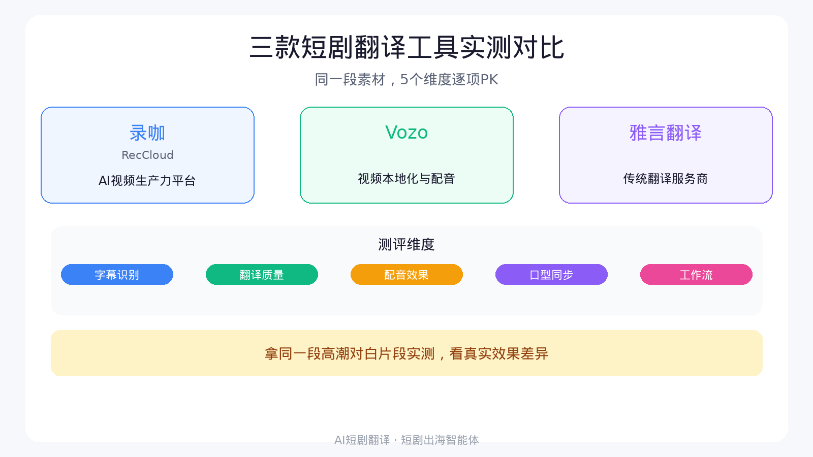 这篇测评的做法很简单:拿同一段短剧素材,分别在录咖(RecCloud)、Vozo、雅言翻译三家跑一遍完整流程,从字幕识别到翻译、配音、口型同步,逐项对比实际效果。