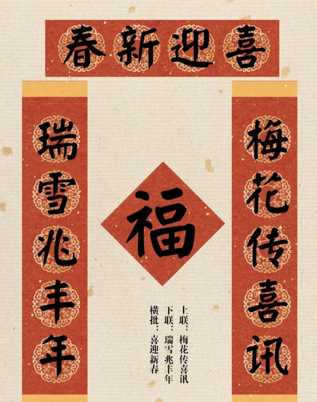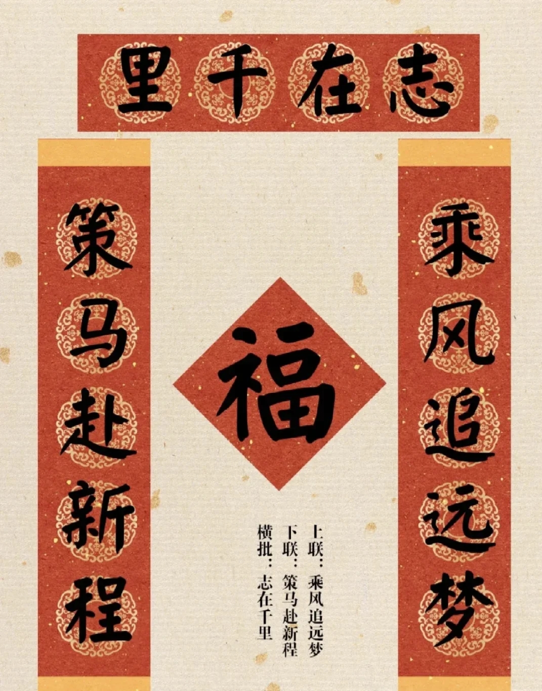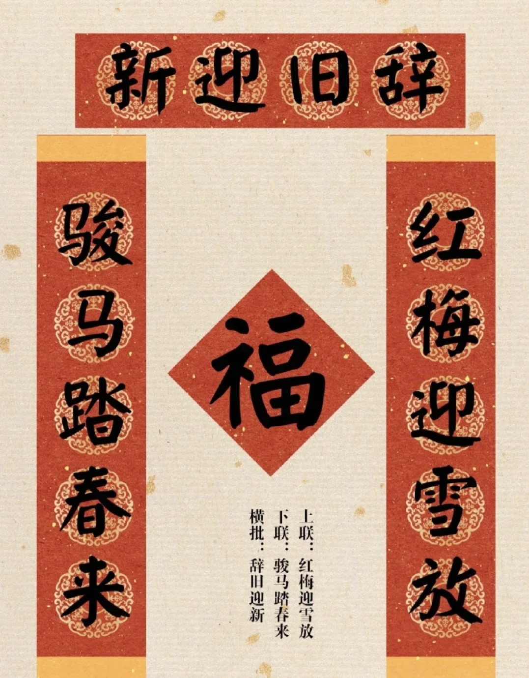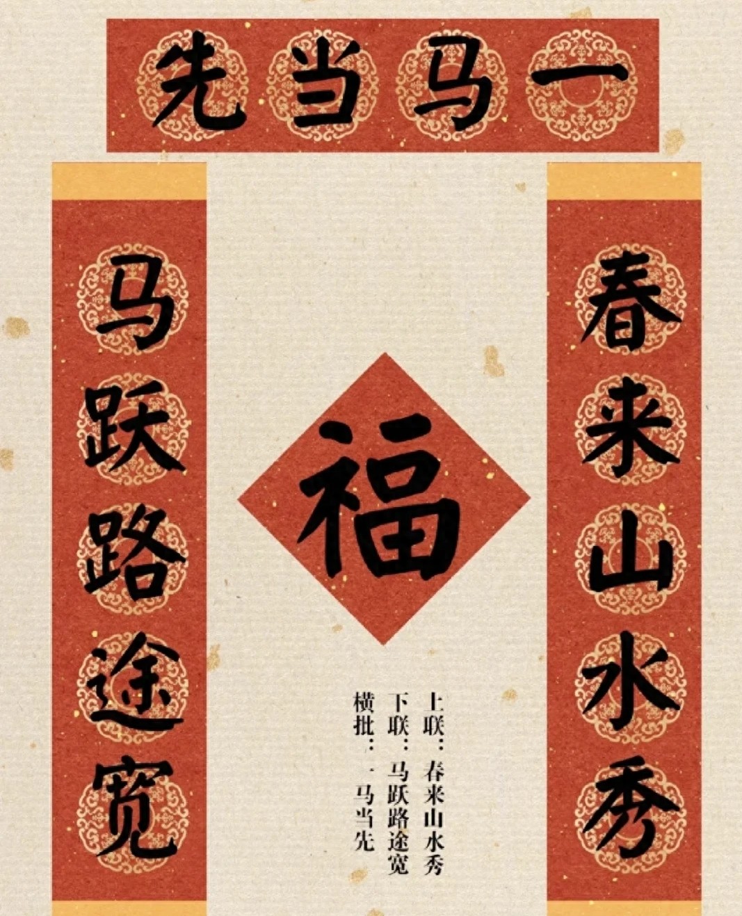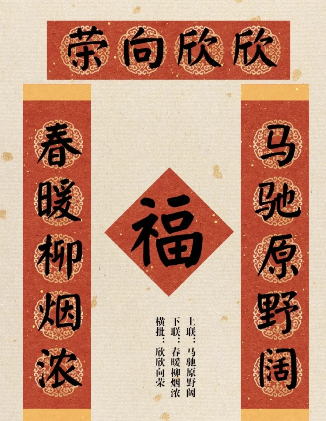 马年五言春联,以五字成句,对仗工整,融入“马”之奔腾意象,寄寓“马到成功”“龙马精神”之祥瑞;笔墨凝练,意境开阔,红纸金字,既纳福迎春,又显东方书画之美,堪称年节“微型诗画”。