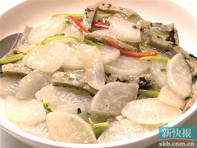 先说一味“大根煎煮鲮鱼滑”,大根就是我们俗称的白萝卜,这道菜上桌时看起来朴实无华,还带着点平平无奇的观感。但一入口,几乎每个人都本能地发出一声“哇哦”——打过霜、重量有七八斤的大白萝卜简直不要太清甜,又稍微借了些鲮鱼滑的鲜味,如入化境,完全停不下来。