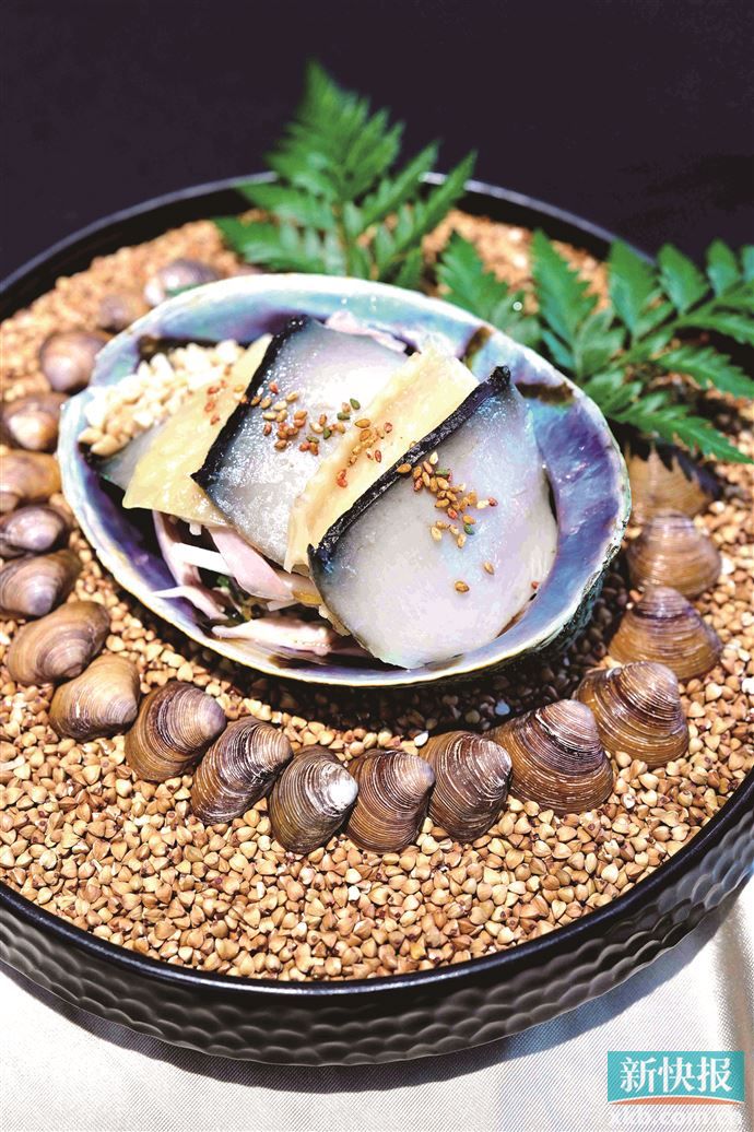 ■新西兰黑金鲍捞起脆皮竹虫鸡,顺德捞起的做法,黑金鲍低温慢烹数小时,搭配爽脆鸡皮非常合拍。