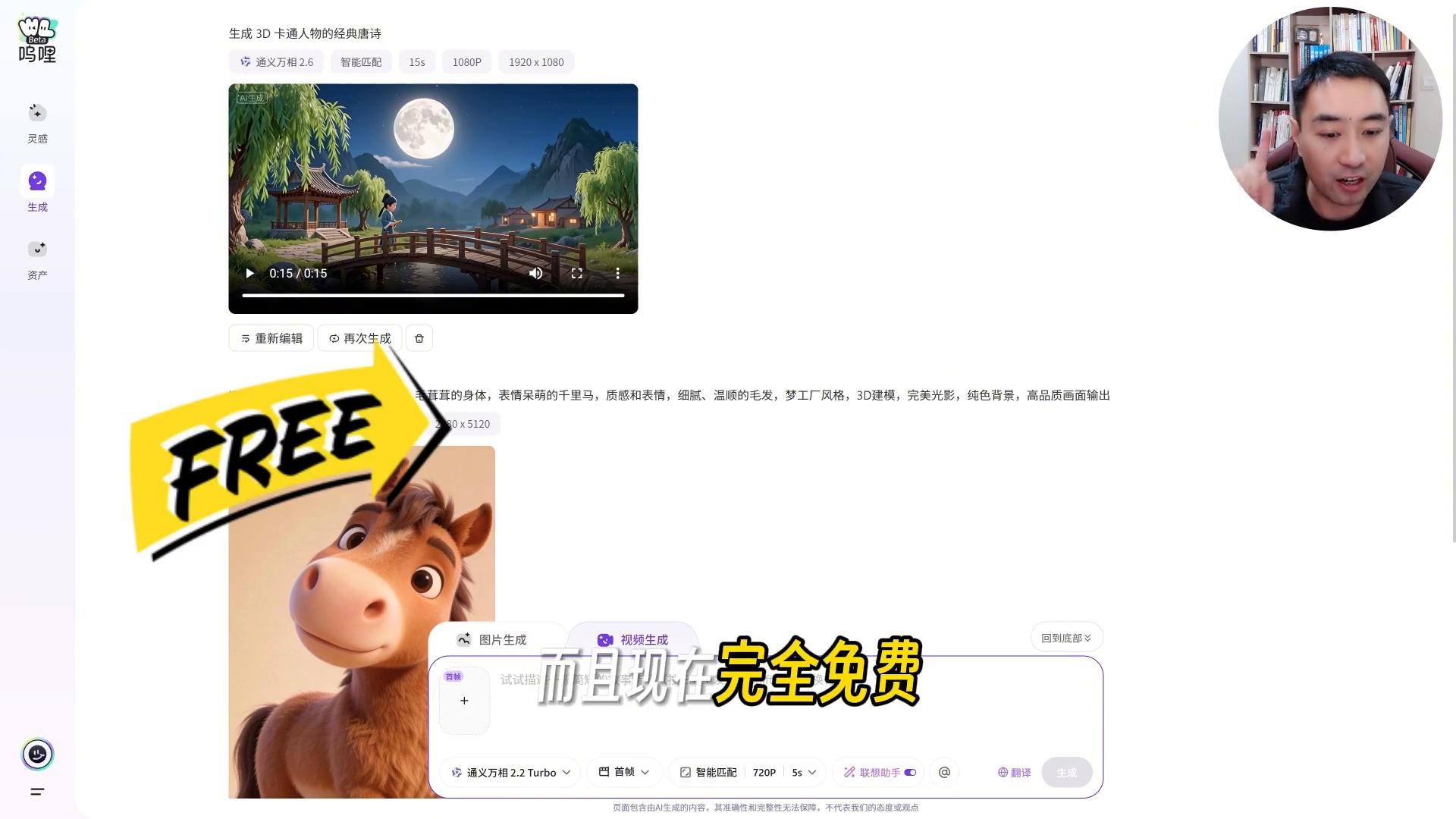 给大家来看一下我刚才生成的1080P15秒的古诗词视频,给大家来看一下生成的效果如何。这是1080P的15秒的床前明月光,疑是地上霜。举头望明月,低头思故乡。不错吧兄弟们,生成的视频底下是我生成的图片,用极梦生成的,生成的效果也是非常好。重点是所有的这些生成是完全免费的,没有任何的限制。