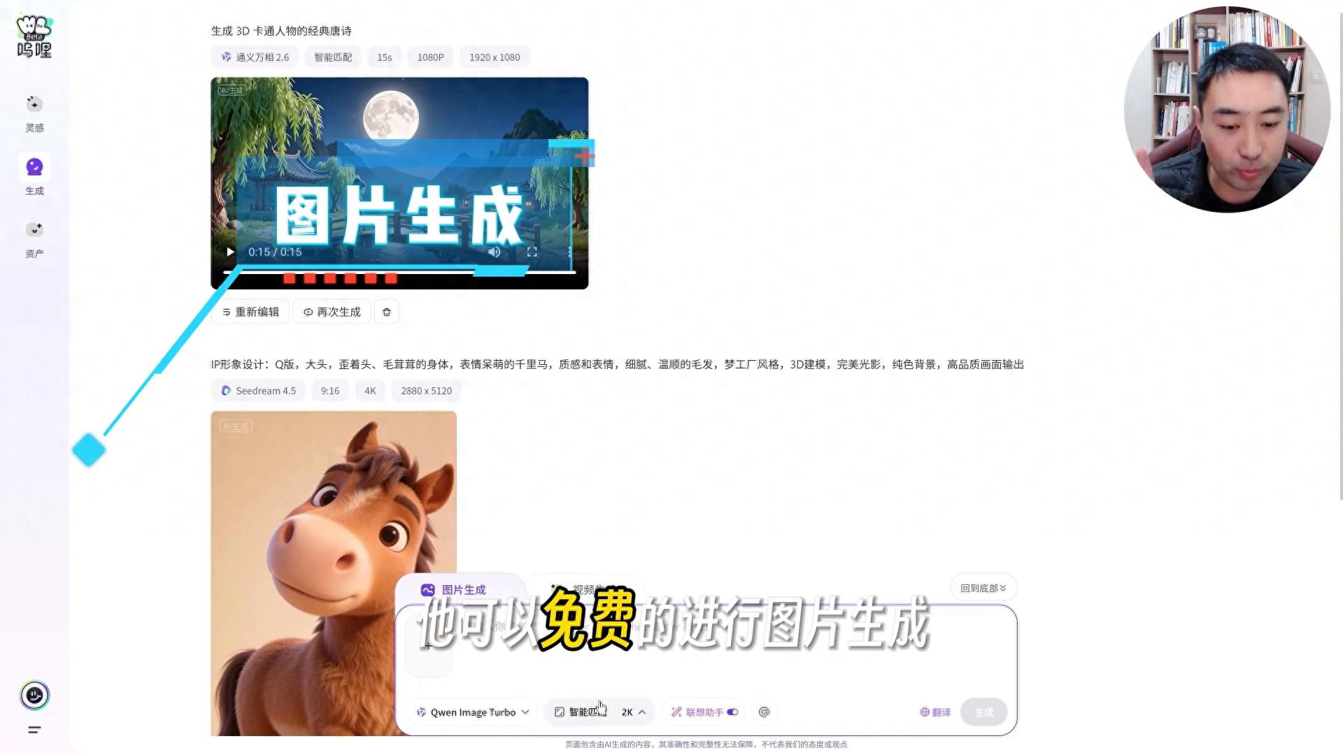 给大家来看一下,在图片生成里面有千问本身的模型、万象的模型还有极梦的模型。纹身图免费,图生图也是免费的。而且重点是视频生成,可以生成1080P15秒的视频,而且现在完全免费,没有任何次数限制。里面支持的模型也很多,像万象的万象2.6的、可灵的、极梦的这些模型都是支持的。
