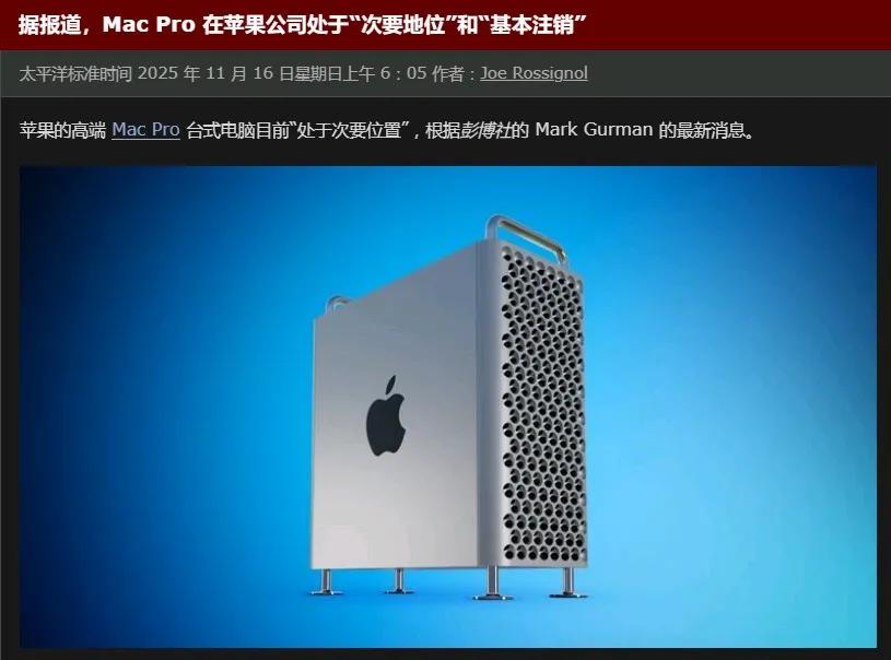 彭博社Mark Gurman近日透露,苹果基本上已经放弃了对Mac Pro的更新,原计划为Mac Pro搭载的M4 Ultra芯片也不再研发了。