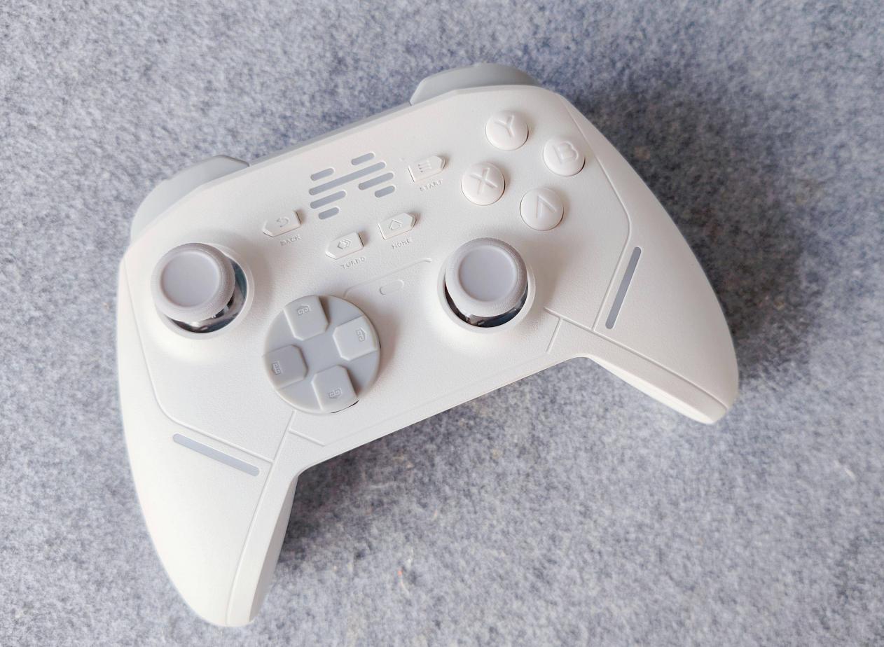 这款手柄最具辨识度的设计来自三段式磁吸外壳,顶部面盖与两侧握把都能独立拆卸,支持自由更换与个性化搭配;随机还附带两种不同形态的十字键方案,满足不同玩家的操控偏好。手柄整体做工扎实,握持区贴合度高,长时间游戏也比较稳。核心操控方面,摇杆采用12bit、4096级高分辨率方案,顺滑细腻、回中稳定,适合精细瞄准与慢推操作;动作按键与肩键采用机械微动结构,触发行程短、反馈明确。扳机采用激光防滑纹理,并提供双模式切换,在竞速与格斗等不同类型游戏中的区分感比较明显。