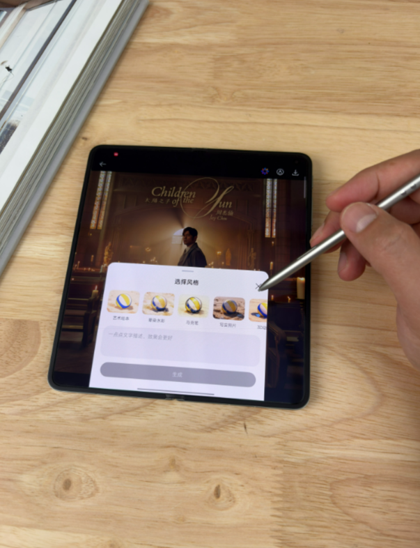 像是应援海报制作,按我的ps水平最少要搞一天,但现在这件事在find n6上就特简单,只需将需要的素材拉到便签里,再用配套的手写笔圈选识别→AI绘图画→再敲定想要生成的风格,一张自带马克笔画风的杰伦《太阳之子》图就搞定了,后面再加加字微调即可,一分钟不到就能做一张,你就说方不方便?
