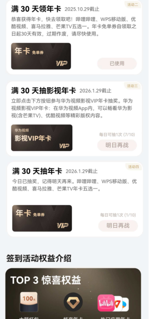 我本以为这就是全部了,直到我首次签到打卡后第30天,才发现还能抽年卡免单券。有哔哩哔哩、WPS移动版、优酷视频、喜马拉雅、芒果TV五款应用的会员年卡五选一!每天可以抽奖1次,共有10次机会。这下如果真的抽中年卡兑换券的话,未来一年不管是移动办公还是追番看综艺,都会员自由了!