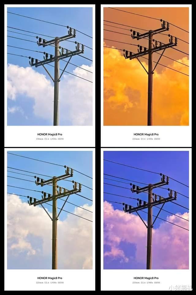 荣耀Magic8 Pro不仅支持多种拍摄模式,如全景模式、微距模式、慢动作模式、延时摄影模式等,它还搭载了行业首发 AI 追色功能,内置浪漫蓝调、金色秋日、暖调夕阳三种预设模板,带来新颖拍摄体验,大家可以根据自己的创意和想法,选择不同的拍摄模式,拍摄出独特的照片和视频。AI 追色功能还支持相机直接导入拍摄、图库编辑、任意门等多种入口选择,而YOYO 指令、三方应用调用也会在后续升级中支持。