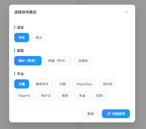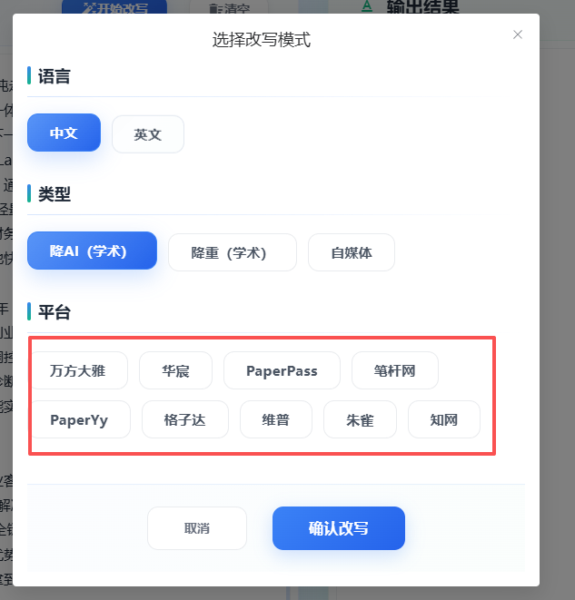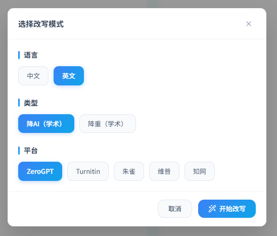 我们再来分析这个网站的改写模式,覆盖了中文和英文的主要AIGC率平台。傻瓜式操作,选择对应的平台即可。