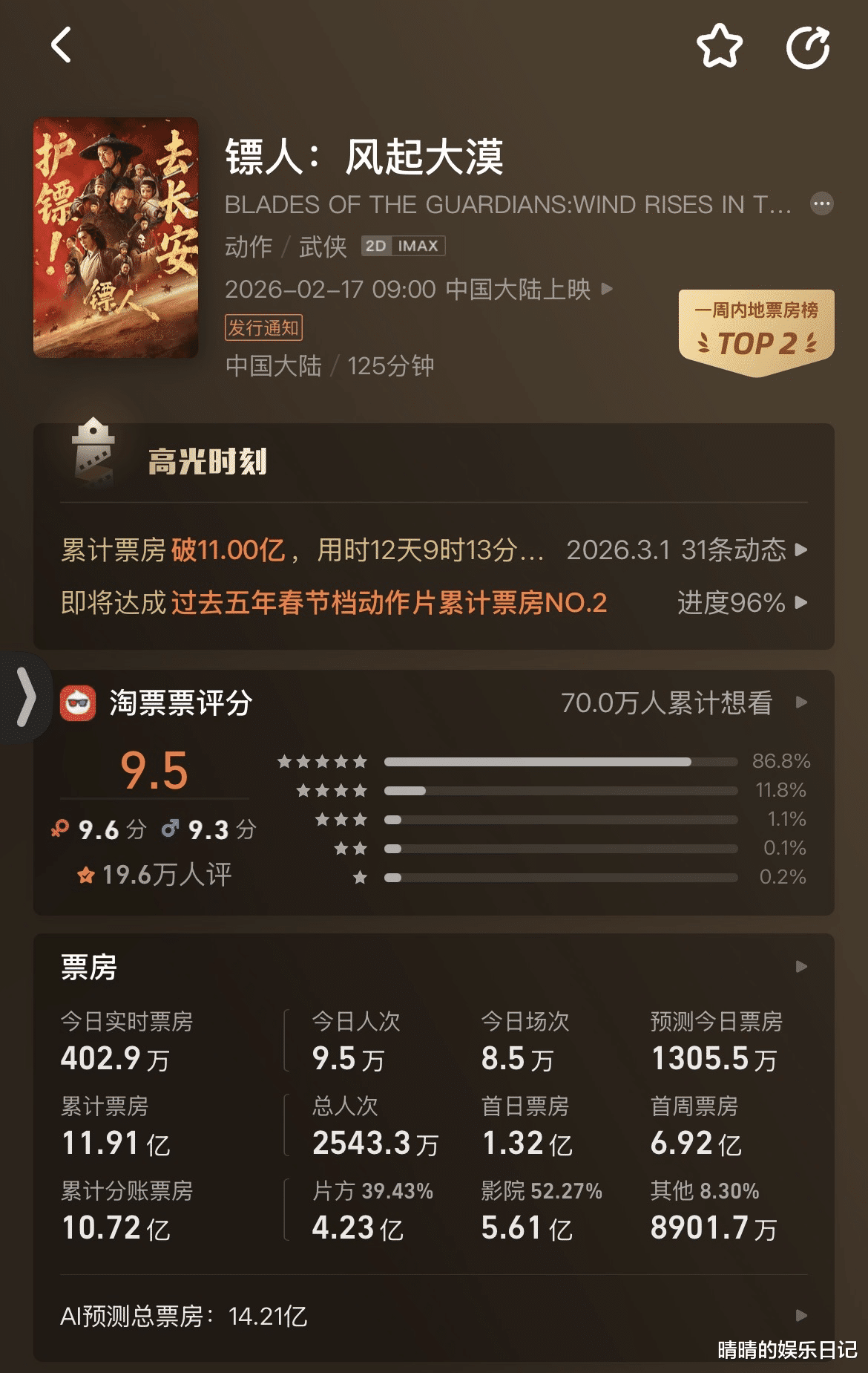 它刷新了《射雕英雄传:侠之大者》保持的6.89亿纪录,登顶中国影史武侠片票房冠军 。