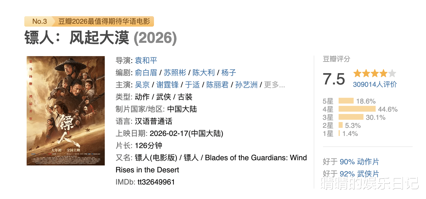 它豆瓣评分7.5,是2026春节档口碑第一,甚至被誉为“近十年最好的武侠片” 。