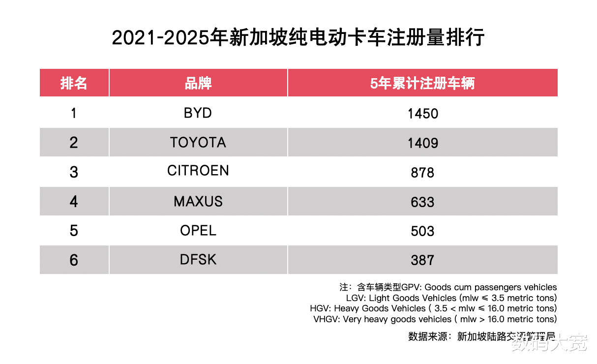 在电动卡车领域,比亚迪同样展现了先发优势。2020年,比亚迪率先进入新加坡市场并交付了T9环卫车,成为当地首家销售电动卡车的企业。在随后的2021年至2025年间,比亚迪纯电卡车在新加坡的累计注册量达到1450台,稳居市场榜首。