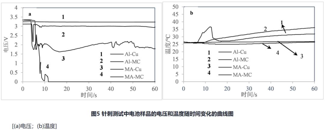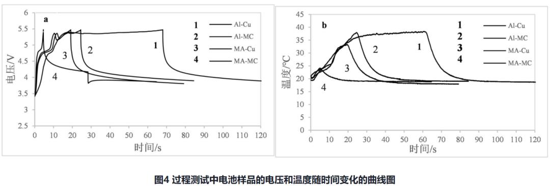 (3)MA箔由于塑料层较厚且导电性较差,故相较于MC箔能够在短路、过充、针刺等安全测试中更早地达到截止条件,因而可快速切断内部短路的进一步发生,较金属箔材电池具有更优异的安全特性;从电池安全特性角度对比,4组电池中安全性能最差的为Al-Cu电池,随后依次为Al-MC电池、MA-Cu电池,安全性能最好的为MA-MC电池。