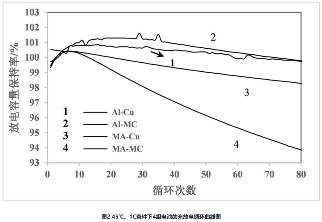 在45℃、1C条件下对4组电池进行充放电循环测试,其充放电循环曲线图见图2。由图可知:循环80次后,Al-Cu电池与Al-MC电池放电容量衰减趋势接近,容量保持率均保持在99.7%,证明这2组电池具有良好的循环稳定性;对应的复合铝箔较金属铝箔极片内阻增长较多,会恶化电池的循环稳定性,故MA-Cu电池和MA-MC电池循环80次后容量保持率分别为98.2%和93.8%,相对而言MA-MC电池衰减最快,测试结果与EIS图中对应的RSEI与RS趋势相吻合。