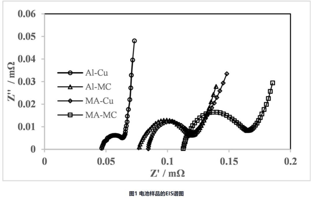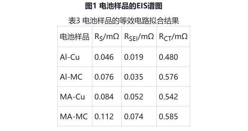 电池样品的EIS谱图以及等效电路拟合结果分别见图1和表3。EIS高频区半圆为固体电解质界面膜(SEI膜)阻抗(RSEI),与横坐标交点为电池欧姆阻抗(Rs),中频区为电化学反应电荷转移阻抗(RCT),斜线对应的是Li+在活性材料内部固相扩散 Warburg阻抗(Zw)。由于极片设计相同,故4组电池的Zw基本一致,同时RCT变化也较小。箔材导电性差异造成4组电池RS从大到小趋势依次为MA-MC电池>MA-Cu电池>Al-MC电池>Al-Cu电池;对应的RSEI趋势与RS基本接近,可能与电池在化成时由于Rs差异造成SEI生成过程中会产生更多的副反应产物,其结果可能会影响电池的循环性能。