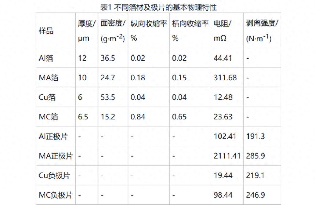 复合铜箔(MC,4.5μm基材双面1μm镀铜)、复合铝箔(MA,8μm基材双面1μm镀铝)、金属铝箔(Al箔,厚度12μm),扬州纳力新材料公司;金属铜箔(Cu箔,6μm),安庆慧儒铜箔公司。