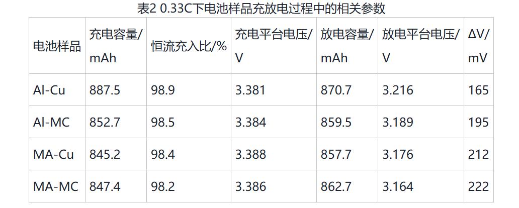 0.33C下电池样品的充放电过程中的相关参数见表2。采用不同箔材的电池充放电容量差异不大,表明复合箔材没有弱化电池的容量特性。4组电池恒流充入比分别为98.2%、98.4%、98.5%、98.9%;充放电压差(∆V)分别为222mV、212mV、195mV、165mV;其中Al-Cu电池的恒流比最高、充放电压差最小,表明电池极化最低,其特征与金属箔材制备的极片电阻最低相吻合,而使用复合箔材制备的极片电阻增加会提升电池极化,与复合箔材会增加极片电阻的趋势一致。