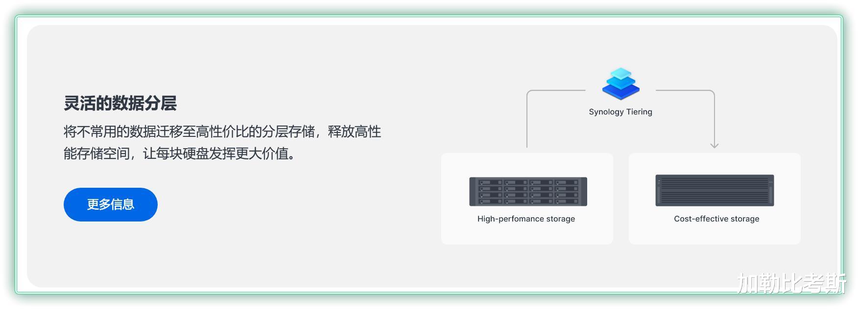 支持分层存储(SynologyTiering):这项以往在高端企业级存储上才有的功能,现在也来到了群晖NAS上。系统能自动分析数据访问频率,将“热数据”放在高性能介质(如SSD),“冷数据”迁移到大容量、低成本的介质(如HDD),让你在性能和成本之间找到完美平衡。