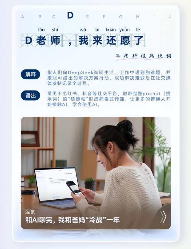 看到“D老师,我来还愿了”的时候,瞬间回想起年初被DeepSeek支配的恐惧与惊喜,那时候D老师横空出世甚至震惊海外,几乎全网都在抄作业;再看到 鸡排哥那句“做完你的做你的”,瞬间拉回到国庆景德镇之旅;还有“正式确诊为哪吒”的年度职场自嘲,每一个和我在2025这一年的记忆重叠。这份榜单做得太暖心了,不仅是在盘点热梗词,更是带我们重温了一遍2025,有梗有料。