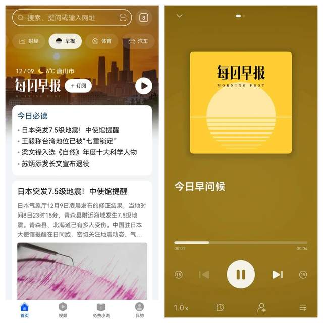 另外,对于像我这种早起困难户+通勤党来说,“每日早报”频道简直是资讯救星。洗漱或者挤地铁的时候,点一下就能听新闻,“可听可看”模式非常人性化,播报音不是生硬的机器读字,就像是专业主持人在播报新闻,非常有代入感。最重要的是不用时刻盯着屏幕,利用碎片时间就能把当天的时政、科技热点过一遍,还能根据需要调节速度和定时关闭,非常高效。
