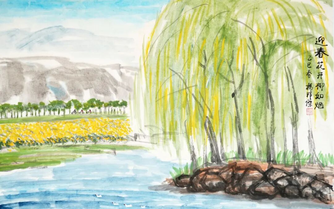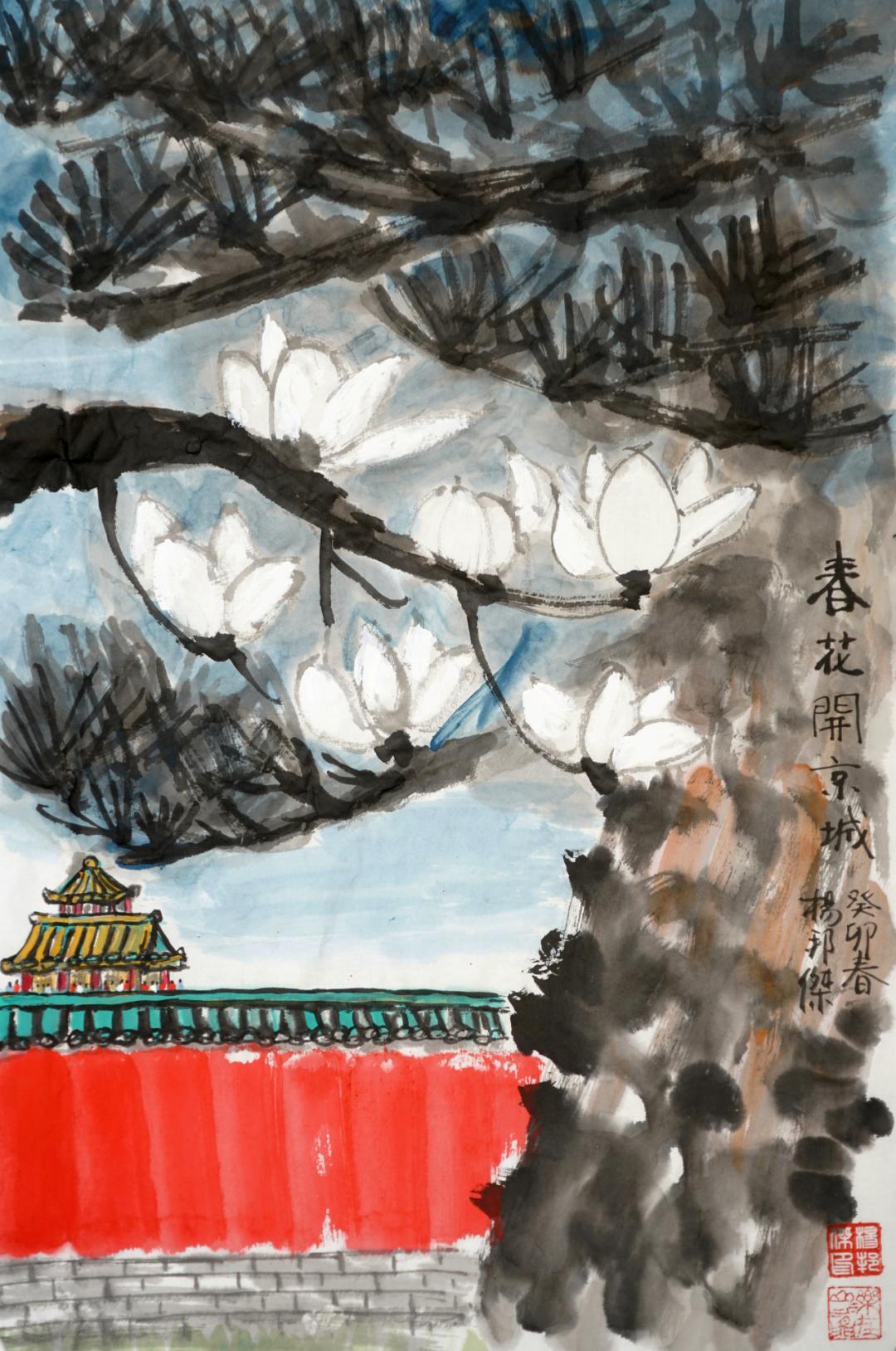 北京迎春的是迎春花、玉兰花。红墙外,山坡上,伴苍松,映蓝天。