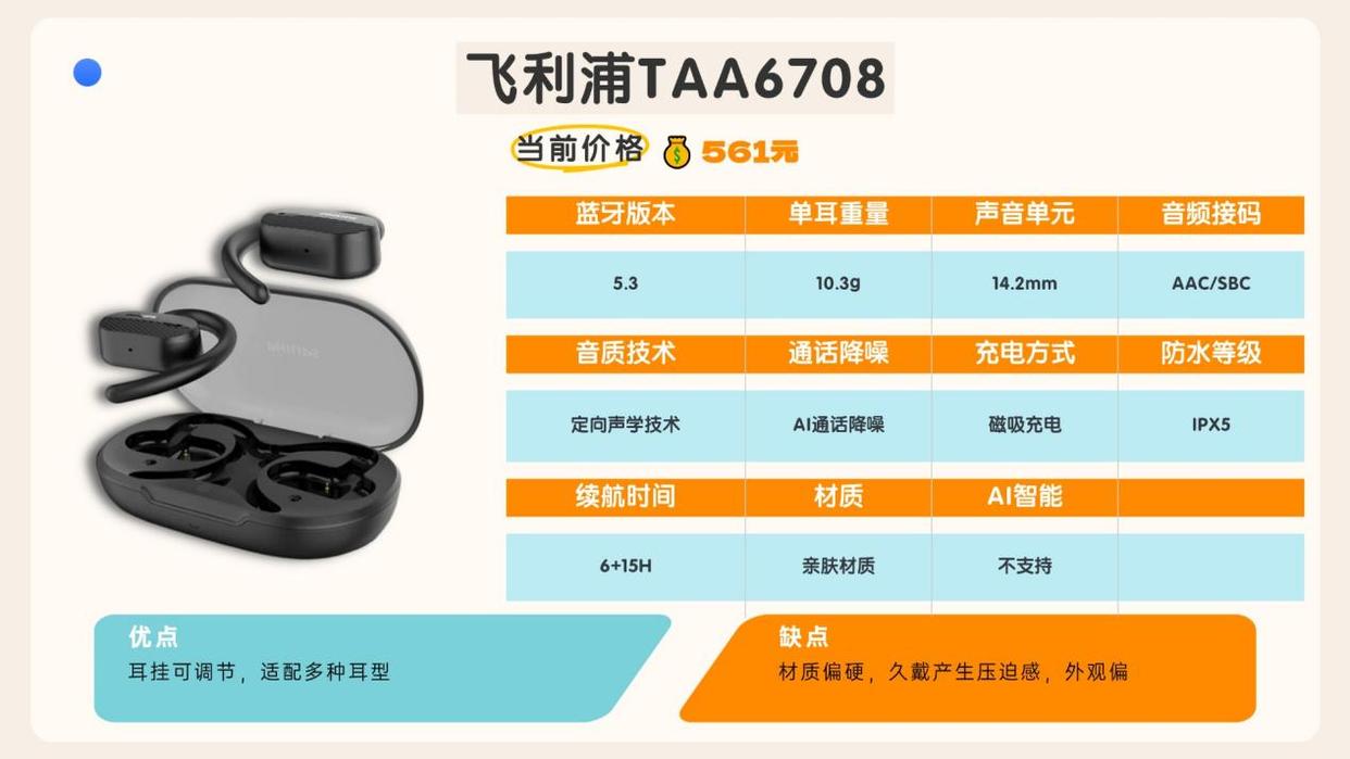 耳机采用了高性能的高通蓝牙芯片,支持Aptx HD信号传输,传输速度更快的同时,声音清晰度也更高,能够达到60ms的超低延迟。此外,耳机的充电仓可以提供长达25小时的续航时间,这使得南卡OE PRO2耳机成为一款便携、高性能、寿命长的耳机产品,各个方面都是主打完善体验的标杆机型,预算足够可以闭眼入。5.飞利浦TAA6708参考价格:561元综合性能评分:78分推荐理由:防水等级还不错,运动时稍微出点汗也没事