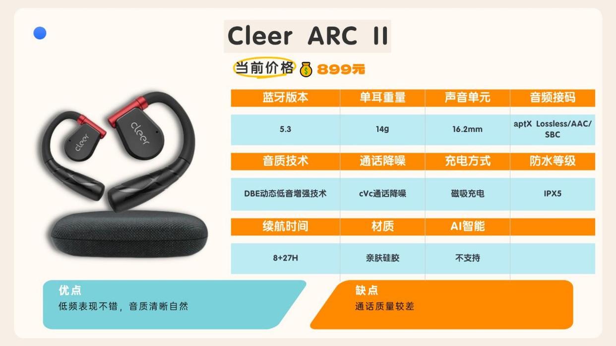 8.Cleer ARC II参考价格:899元综合性能评分:87分推荐理由:耳挂采用了可旋转的设计,可以自由调节适应不同的耳型