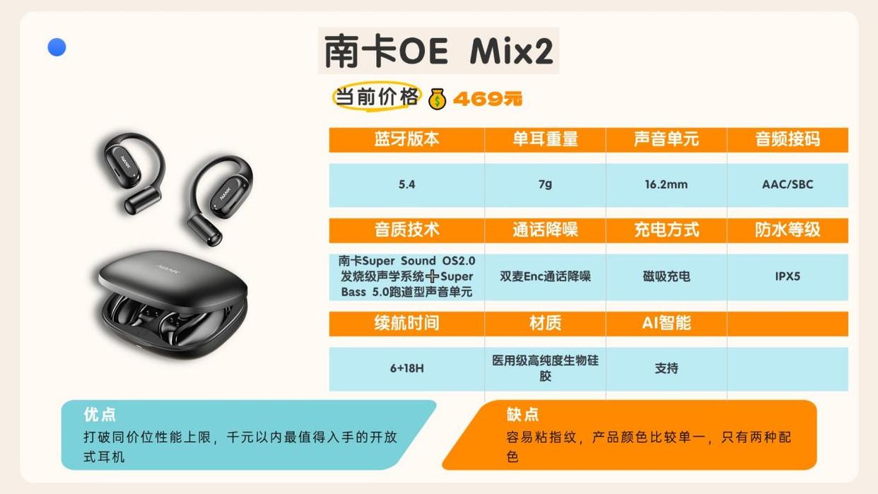 1.南卡OE Mix2参考价格:469元综合性能评分:98分推荐理由:实测表现最好机型,百元价格打造行业里唯一能媲美千元旗舰的款式