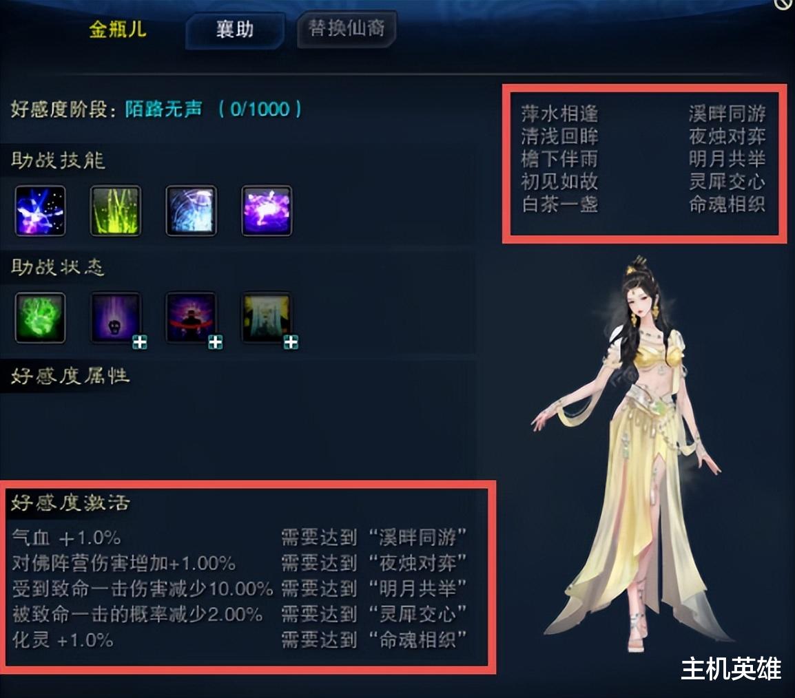 你只需要每天点开【伙伴-襄助】的页面,给NPC送送花聊聊天,就能提升好感度啦,不同的好感度会让NPC们拥有不同的战斗属性,所以在提升之前可以先预览一下下阶段的数值属性哦!另外,突破好感度时会需要用到NPC的本命信物,一般可以在副本中掉落,但如果没有拿到的话,也可以去河阳城找仙礼公子兑换哦!我第一天就拉着陆雪琪去刷T本,她那招「太极玄清道」的增伤效果绝了,关键是再也不用在世界上苦哈哈求组了,社恐狂喜!