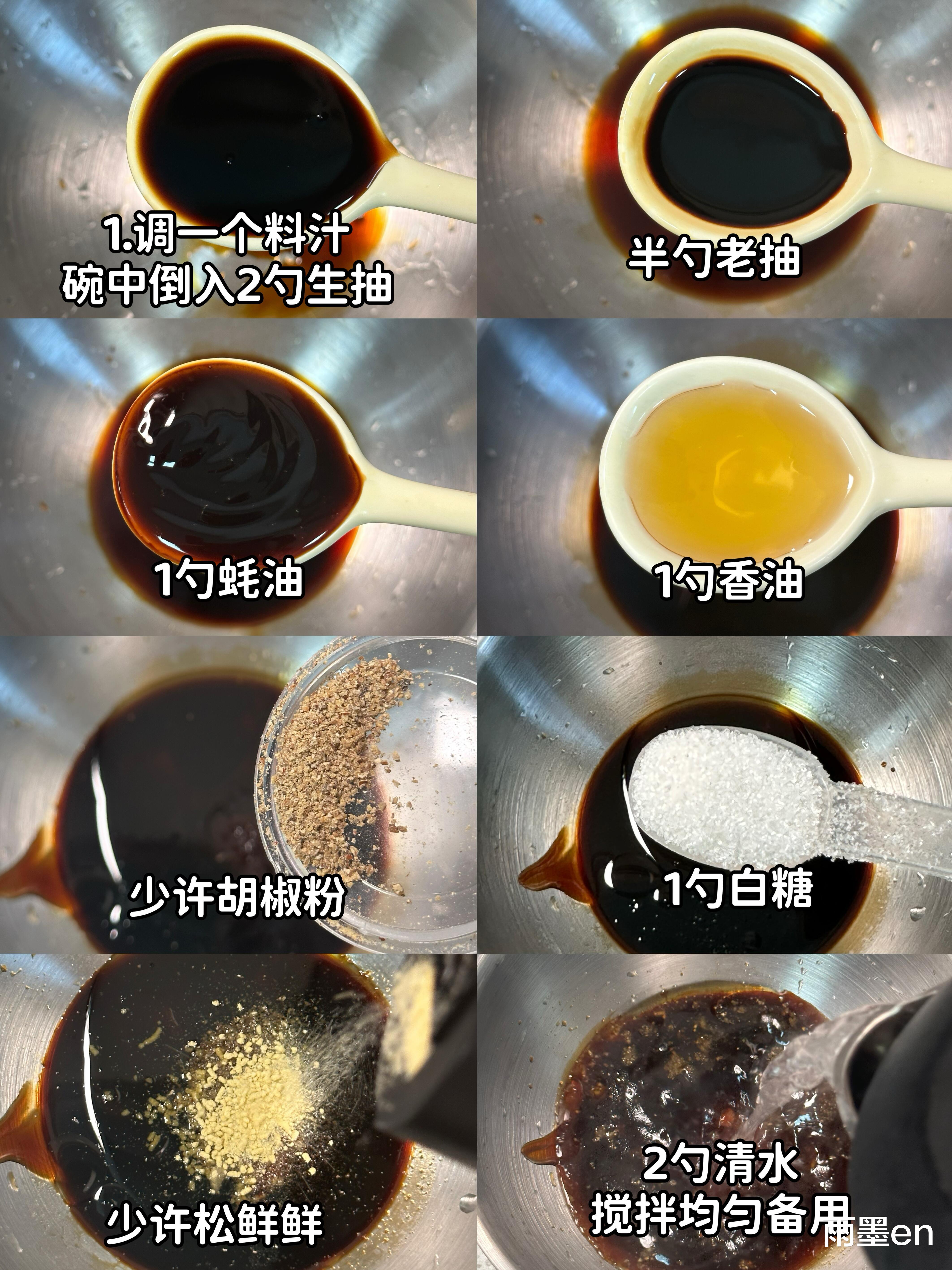 2. 调灵魂酱汁:碗里放入生抽、蚝油、老抽、白糖、清水,搅拌均匀,最后滴几滴香油提香,静置备用(酱汁比例记好,咸甜适中不踩雷)。