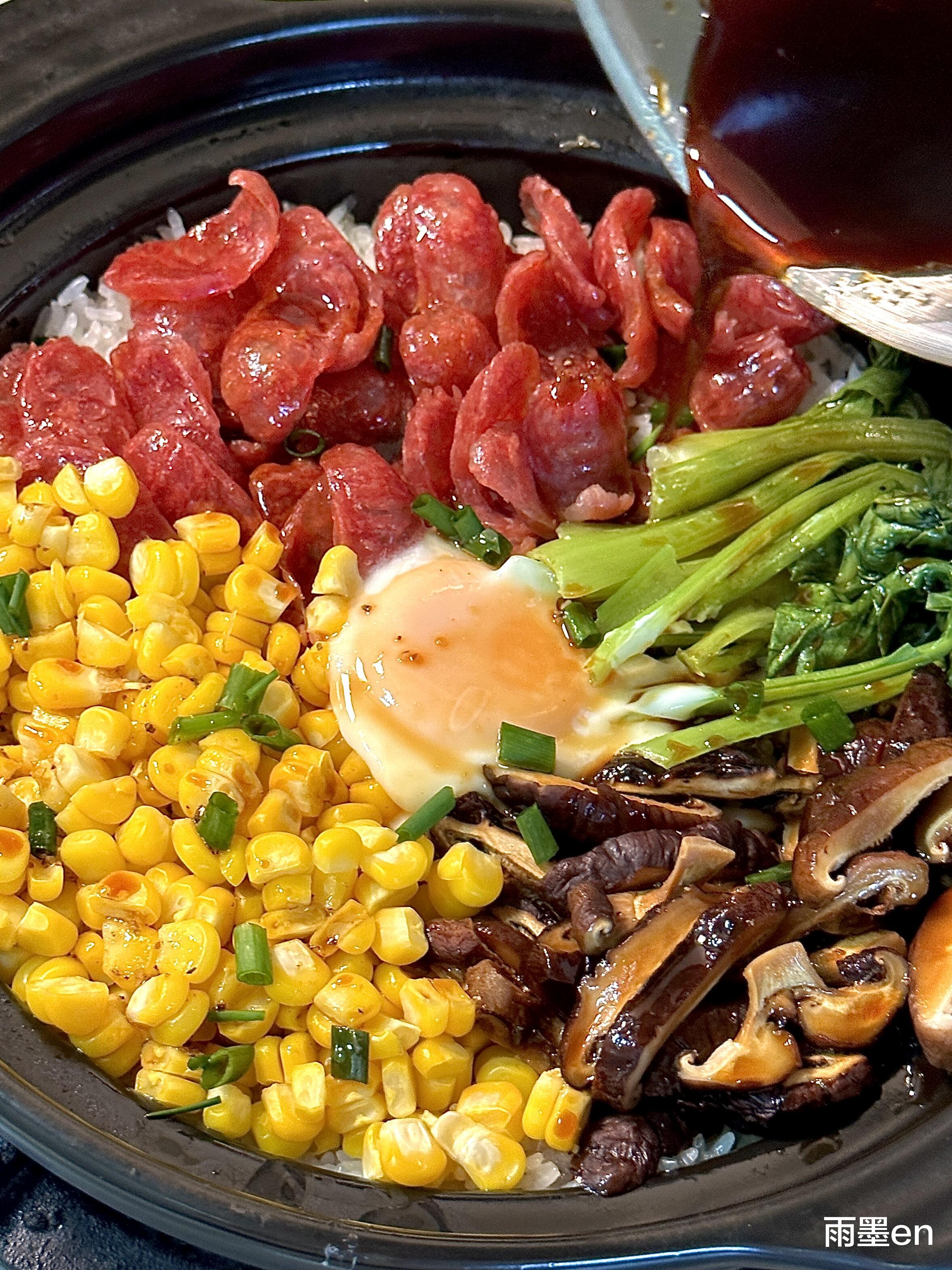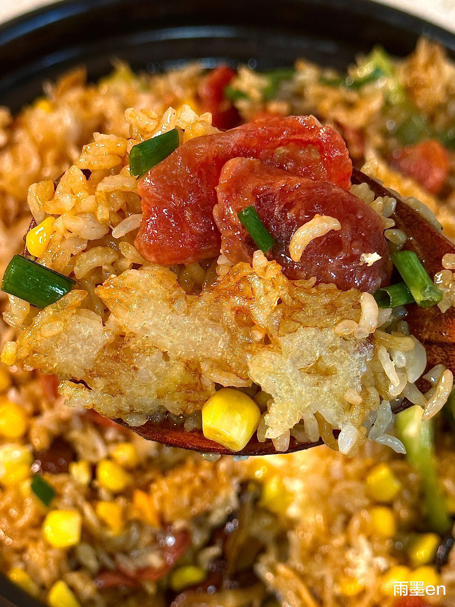 说起腊味煲仔饭,藏着我小时候的过年记忆。小时候外婆家每年冬天都会灌腊肠、腌腊肉,挂在屋檐下风干,等到过年前后,就会给我做煲仔饭。那时候没有砂锅,就用普通铁锅煮,外婆总说“泡米要足、火候要稳”,煮好后掀开锅盖,整个屋子都飘着腊香。